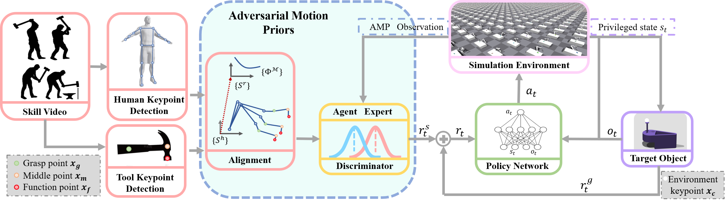 The overall structure of HMAMP. With human manipulation video clips, we extract the keypoints of human arm and manipulation tools. Then we do keypoints alignment between robot arm in simulation and real world human motion clips. The AMP Discriminator is to discriminate whether an action sequence is a real human expert motion or generated by the policy network. The AMP reward and task reward for manipulation task is added to be the total reward for RL training.